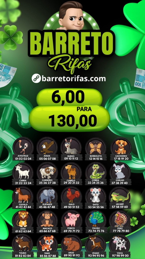 RIFA FAZENDINHA R$ 6,00 PARA R$ 130,00 RIFA PARA 20HS EXTRAÇÃO BAHIA - VAI LÁ E ESCOLHA SEU BICHO. SEJA O PRÓXIMO GANHADOR. @barretorifasof