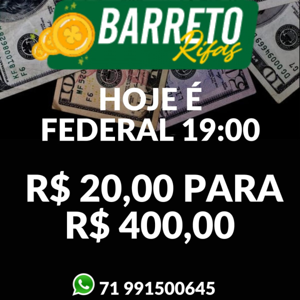 RIFA FAZENDINHA R$ 10 P/200 R$ 20 P/400 RIFA PARA 19 HS EXTRAÇÃO FEDERAL BAHIA - VAI LÁ PEGA SEU GRUPO OU METADE DO GRUPO, E SEJA O PRÓXIMO GANHADOR. @barretorifasof