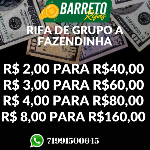 RIFA DE GRUPO A FAZENDINHA - R$ 8,00 PARA R$ 160,00 RIFA PARA 10HS EXTRAÇÃO BAHIA - VAI LÁ PEGA O SEU GRUPO, SEJA O PRÓXIMO GANHADOR. @barretorifasof