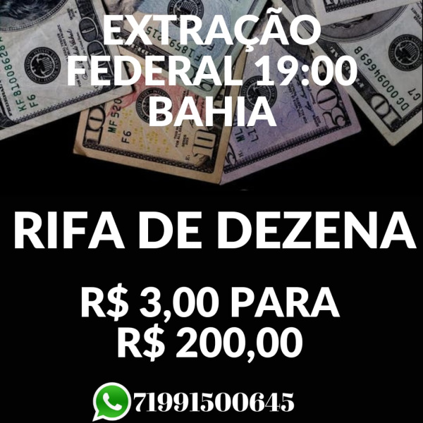 Rifa de dezena 3,00 para 200,00 - Extração Federal Bahia - 19:00 VAI LÁ PEGA SUA DEZENA, VENHA PRO JOGO, BOA SORTE, SEJA O PRÓXIMO GANHADOR. @barretorifasof