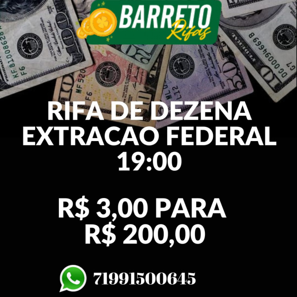Rifa de dezena 3,00 para 200,00 - Extração FEDERAL Bahia - 19:00 VAI LÁ PEGA SUA DEZENA, VENHA PRO JOGO, BOA SORTE, SEJA O PRÓXIMO GANHADOR. @barretorifasof