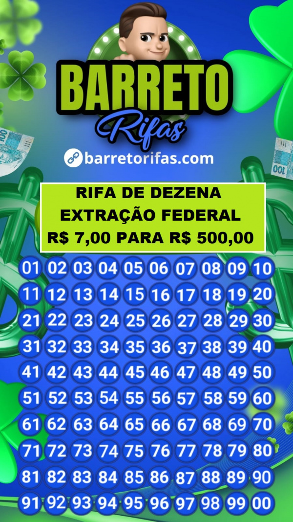 Rifa de dezena R$ 7,00 para R$ 500,00 - Extração Federal Bahia - 19:00 VAI LÁ PEGA SUA DEZENA, VENHA PRO JOGO, BOA SORTE, SEJA O PRÓXIMO GANHADOR. @barretorifasof